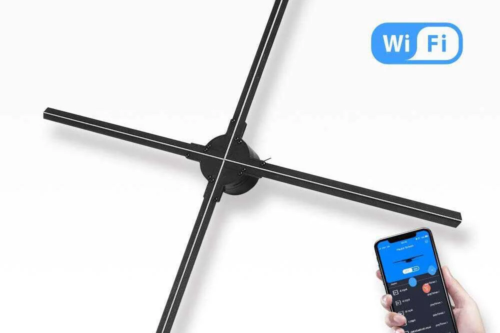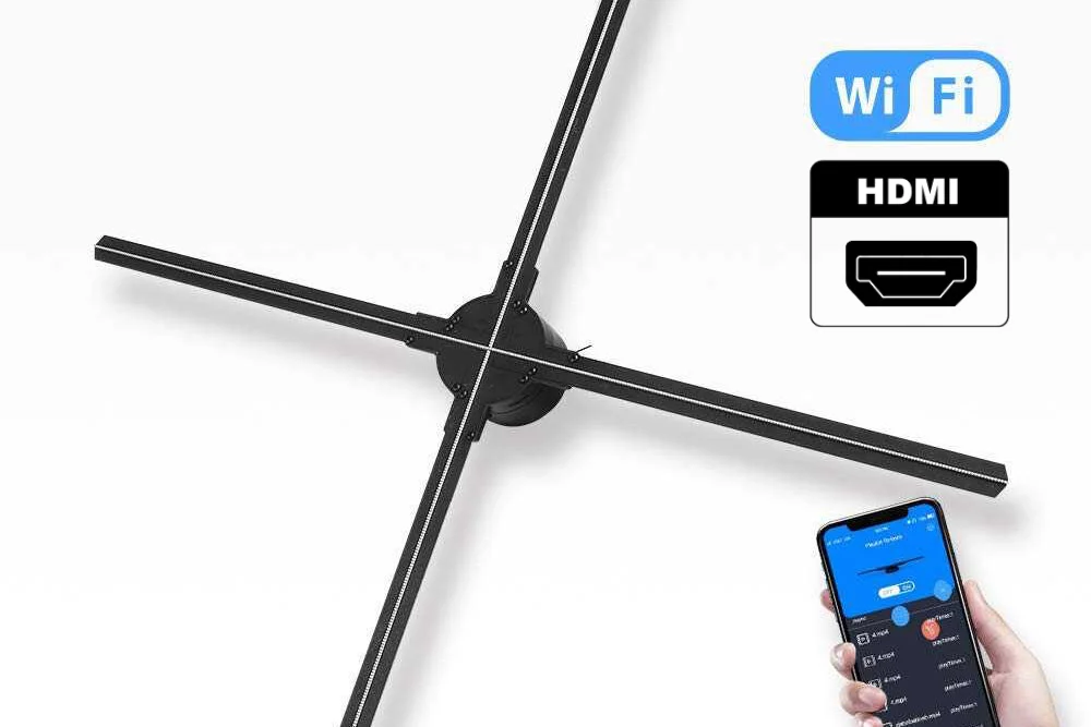 Durch eine punktgenaue Steuerung der LED’s werden Darstellungen möglich ohne dass das menschliche Auge die schnell rotierenden LED Rotorblätter wahrnimmt – das Bild, die Animation oder 3D Film ‘schweben’ im Raum.